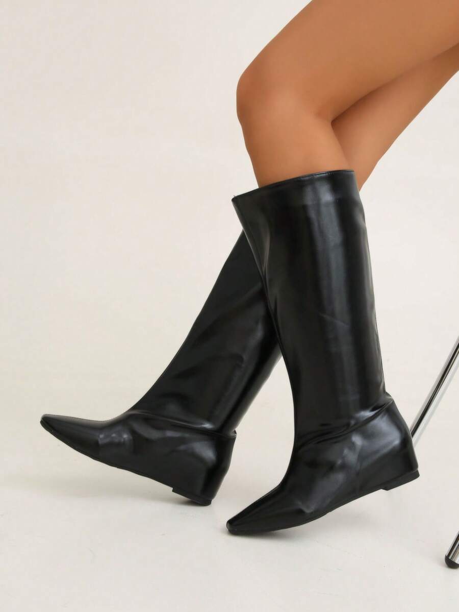SHUZIA بوت نسائية ذات كعب مربع مطوي لامع وجذاب بشكل اللوز، متوسطة الساق