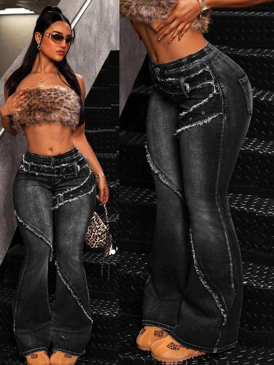 Jeanoix سراويل جينز نسائية ذات خصر منخفض وساق مقطعة مع إبزيم على شكل شمس وفتحات، بنطلون جينز أسود