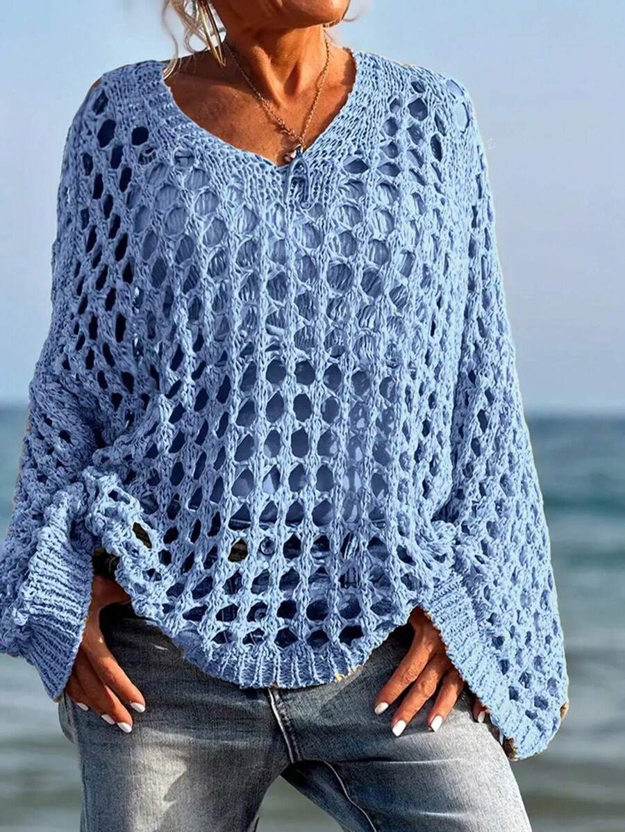 كنزة عصرية بأكمام طويلة مصنوعة من الأفرشة المحبوكة بحجم كبير، بتركيب فضفاض وفتحات عصرية، مناسبة للارتداء الكاجوال وغطاء للشاطئ في فصلي الربيع والصيف للنساء