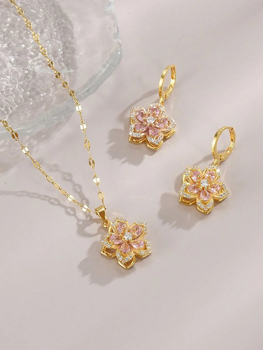 قلادة من الفولاذ المقاوم للصدأ مزينة بأحجار زركونيا مقطوعة على شكل زهرة خماسية البتلات قطعة واحدة، و أقراط من الفولاذ المقاوم للصدأ للنساء مزينة بأحجار زركونيا مقطوعة على شكل زهرة خماسية البتلات قطعة واحدة، هدية عيد الحب، الأم، عيد الأم