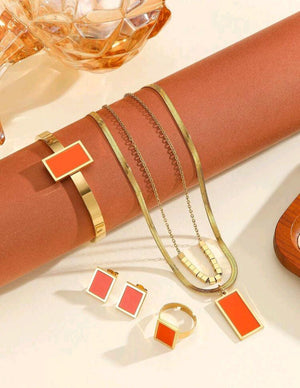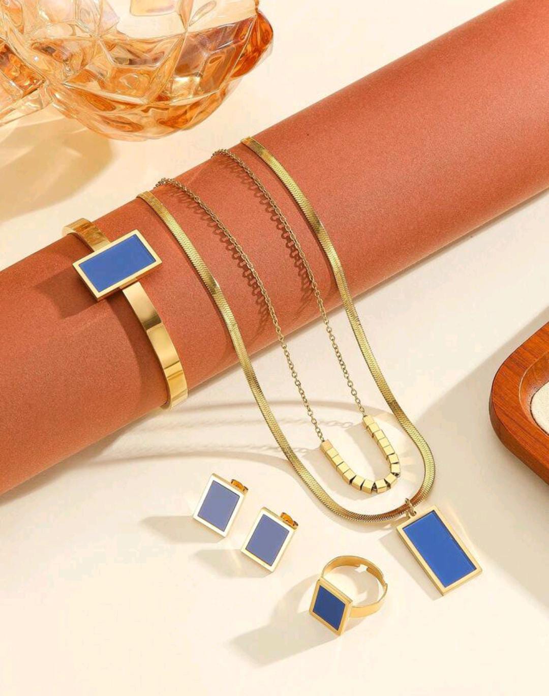5 قطع مجموعة مجوهرات من الفولاذ المقاوم للصدأ متعددة الألوان، تشمل قلادة بسلسلة مزدوجة الطبقة، أقراط، سوار، خاتم، اكسسوارات حفلات، مجموعة مجوهرات عصرية بتصميم هندسي مربع