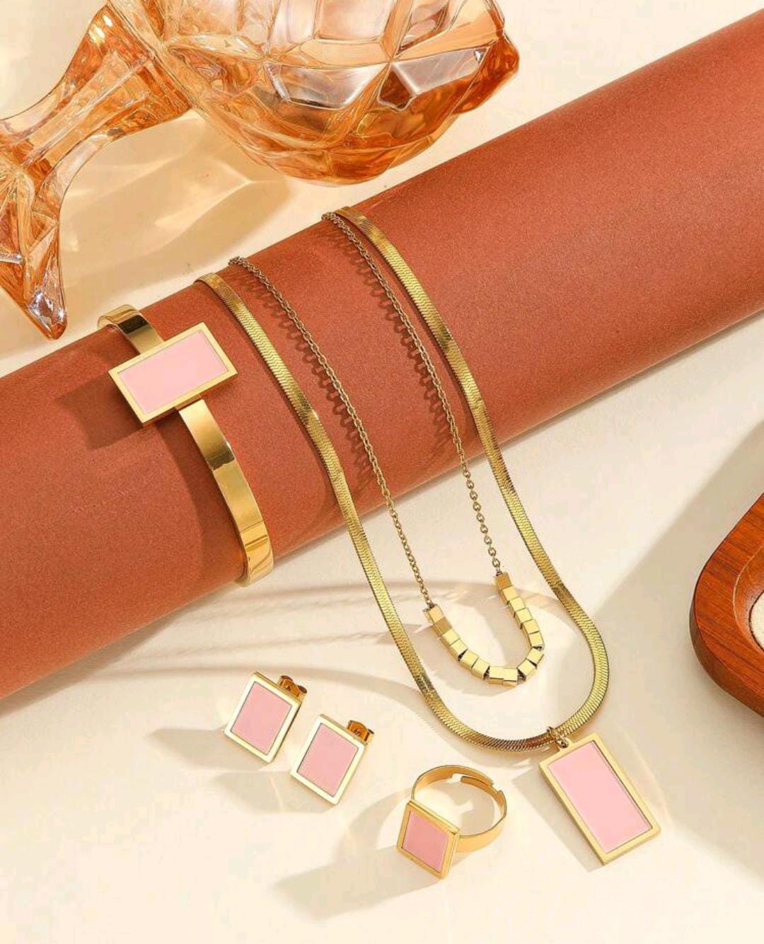 5 قطع مجموعة مجوهرات من الفولاذ المقاوم للصدأ متعددة الألوان، تشمل قلادة بسلسلة مزدوجة الطبقة، أقراط، سوار، خاتم، اكسسوارات حفلات، مجموعة مجوهرات عصرية بتصميم هندسي مربع