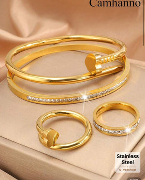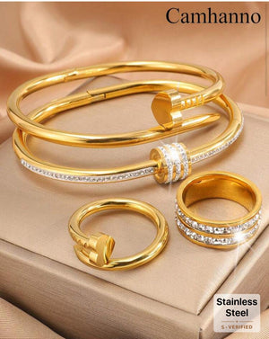 Camhanno 4 قطع مميزة، رائعة، أنيقة، ذات أجواء أنيقة وعصرية من مجموعة الفولاذ المقاوم للصدأ والمكونة من مسمار حب سوار خاتم، مناسبة للارتداء اليومي، هدية للعطلات والصديقات وعيد الأم والأمهات وعيد الأم