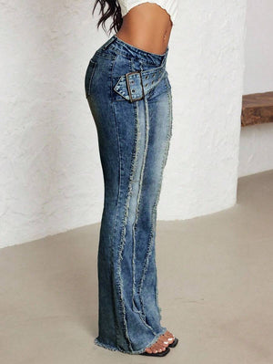 Jeanoix سراويل جينز نسائية ذات خصر منخفض وساق مقطعة مع إبزيم على شكل شمس وفتحات، بنطلون جينز أسود