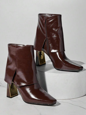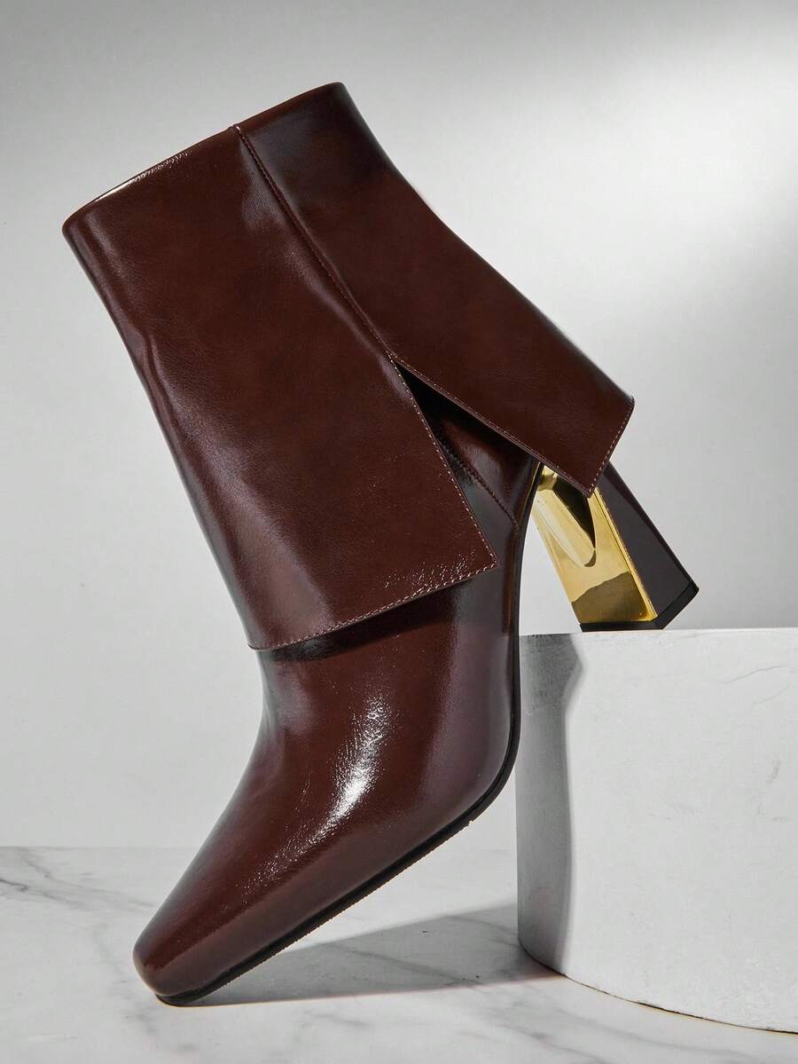 SHUZIA بوت نسائية ذات كعب مربع مطوي لامع وجذاب بشكل اللوز، متوسطة الساق