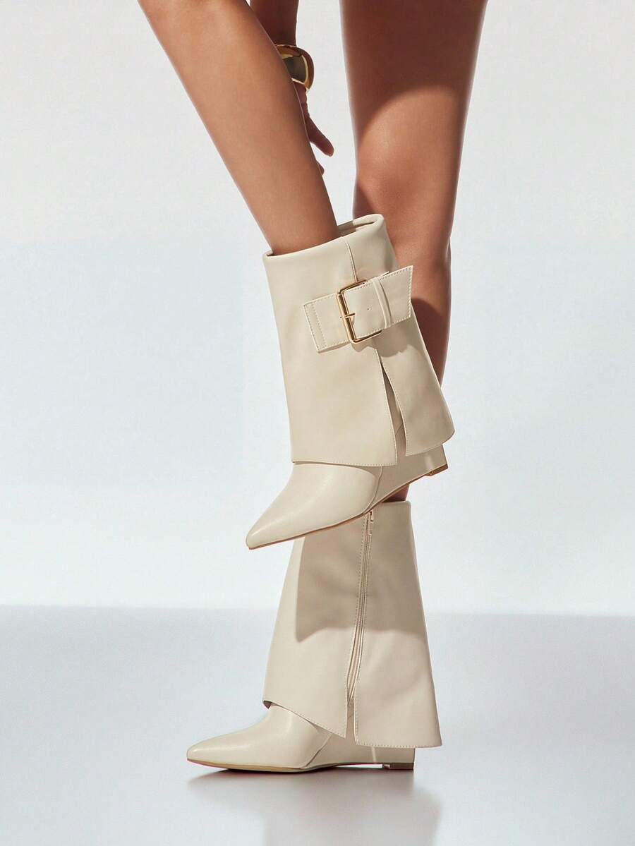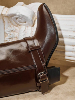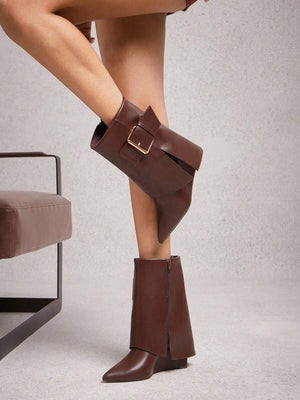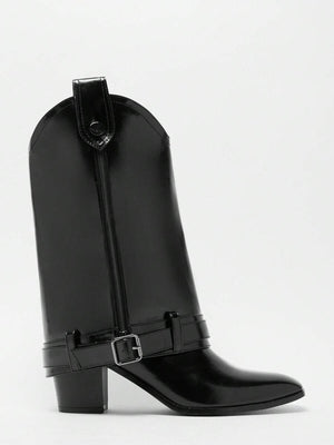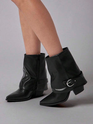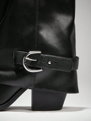 Solezae حذاء بوت نسائي أنيق من جلد PU الاصطناعي الأسود مع حزام مطوي، ذو ارتفاع متوسط للكاحل، مريح للخريف والشتاء والأعياد